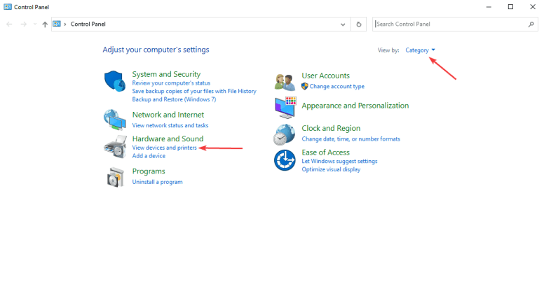 3. Make sure the “View by” in the top right is set to “Category” and then open the “View devices and printers” link under “Hardware and Sound”.