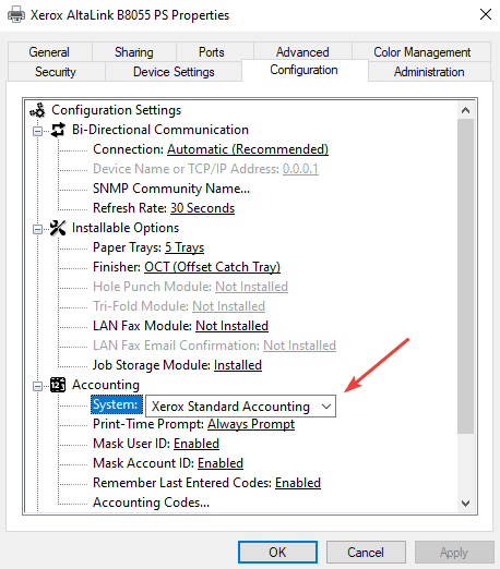 5. Go to the “Configuration” tab and under the “Accounting” section make sure “System” is set to “Xerox Standard Accounting”.