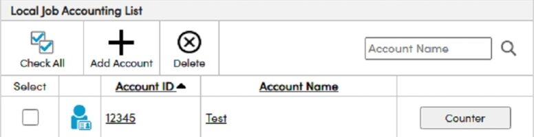 5. Click on Management Settings and Job Accounting. To edit an account click on the Account Name or Account ID. To see the counter for a specific Account click the Counter button across from the Accounts Name.