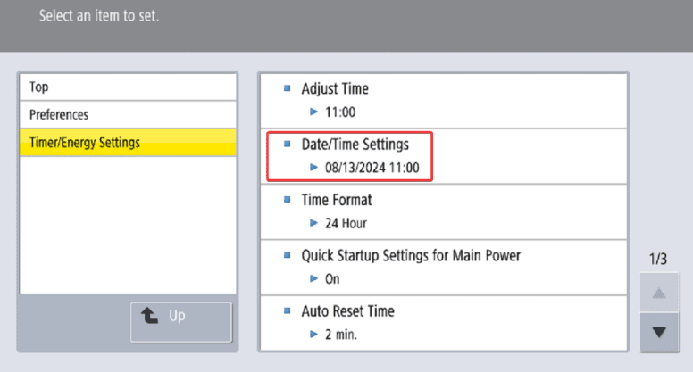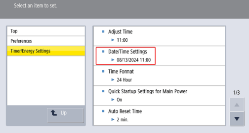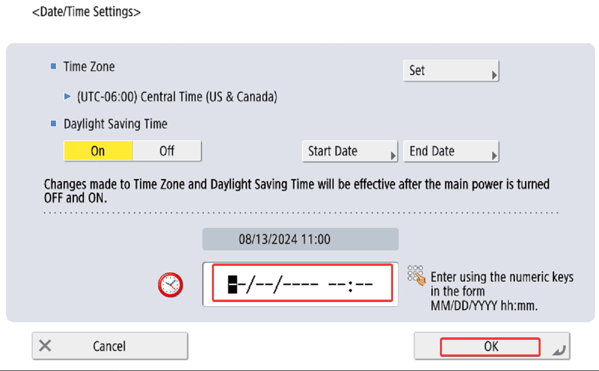 7. At the bottom of the screen input the correct date and time and then select “OK”. After making your changes you will need to restart the copier for them to be applied.