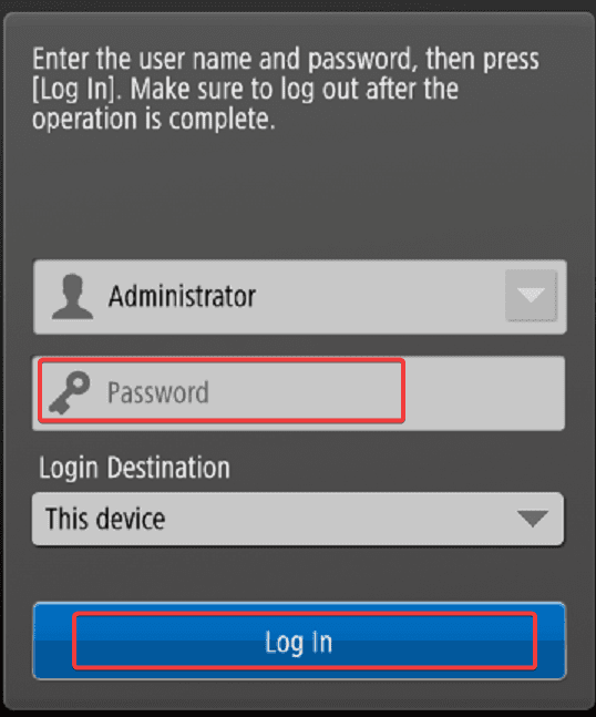 3. Select the “Password” field and input the password with the pop up keyboard and then press “OK” and then “Log in”. The default password 7654321, 1234567 or is left blank.