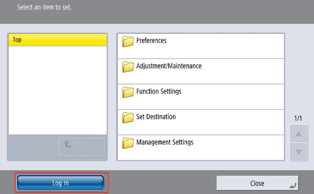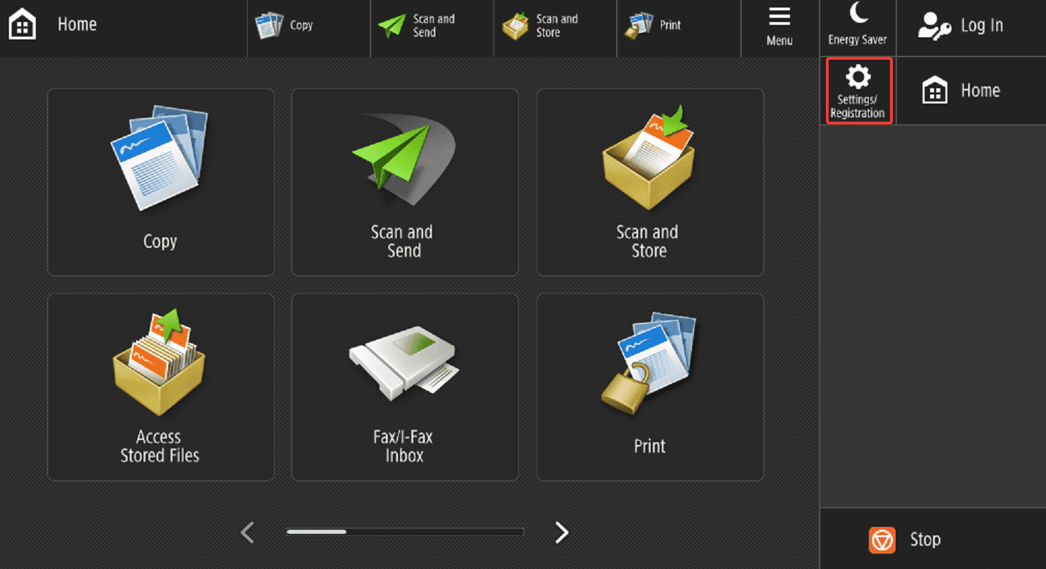 1. From the home screen of the copier press the “Settings/Registration” option. Depending on the model you may have a physical button on the panel.