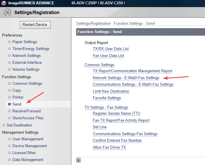 5. Click the “Send” option under “Function Settings” and then click “Network Settings – E-Mail/I-Fax Settings”.