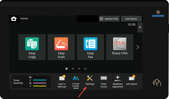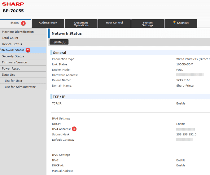 1. Start by getting the IP address from the copier. You can access the IP address by pressing the “Settings” option on the main screen and then press “Network Status” and find the “IPv4 Address”.