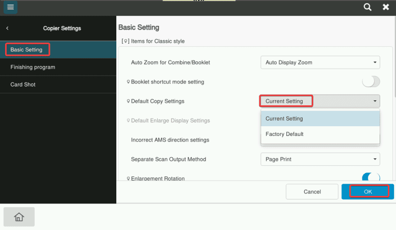 4. Select “Basic Setting”, and then for “Default Copy Settings” change it to current setting if it is not already and then press “OK” at the bottom. Now the copy choices you made in step 1 are the default for copies.