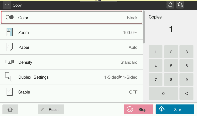 1. Go to the “Copy” screen on the copier and change the settings you would like to be default. For instance you can change color to black and white or one sided to two sided, then press the home button.
