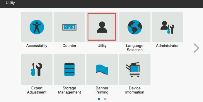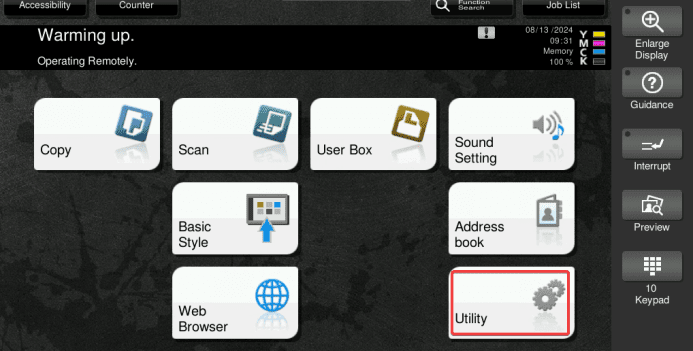 2. At the home screen of the copier press the “Utility” option.
