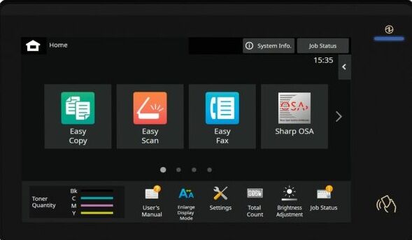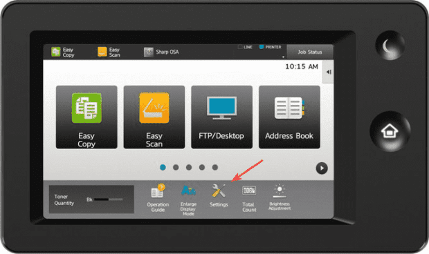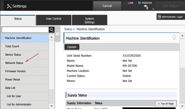 1. You will need the IP address of the copier, to get this go to the machine and press the “Settings” button, “Status tab” and then “Network Status”. You can use our How to Find Your Sharp IP Address guide also.