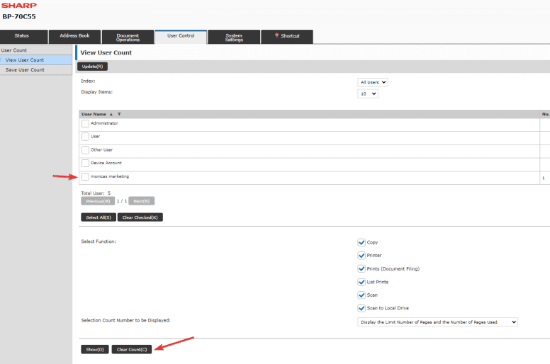 How to Check and Clear Counters for Sharp User Control