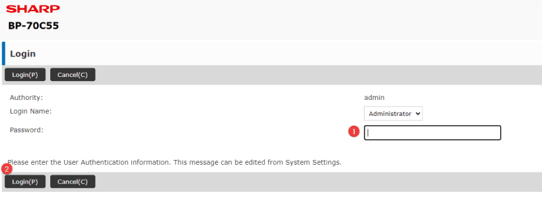 3. Click “Login” at the top right of the screen. Choose Administrator for the username and the default password is admin. If the default password doesn’t work you might need to reach out to your IT dept to see if it has been changed.