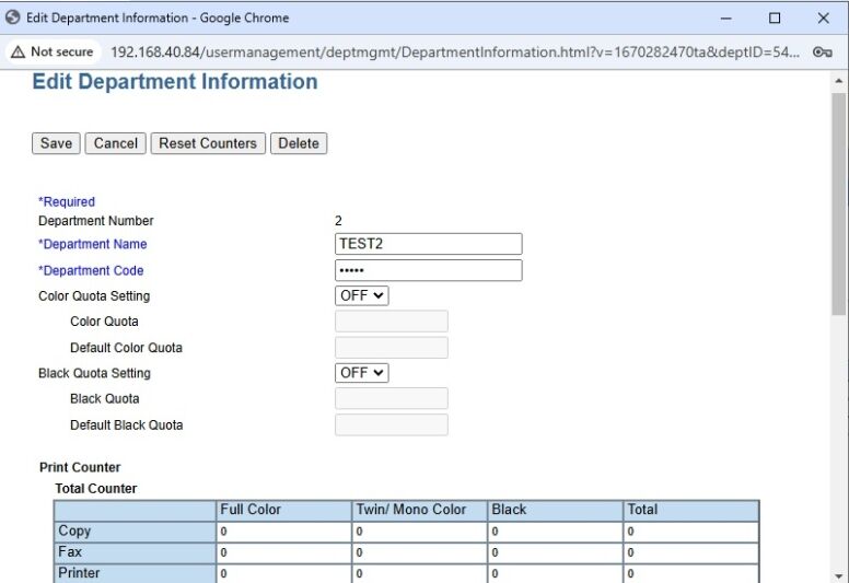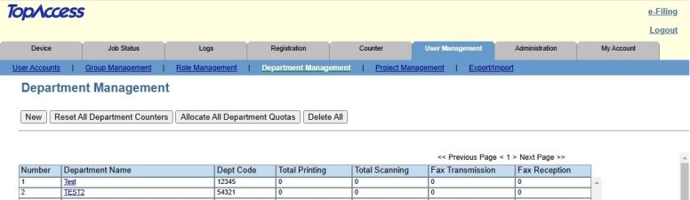 7. Click the User Management tab and Department Management. To Reset all counters for all Accounts click on Reset All Department Counters. For individual Accounts proceed to step 8.