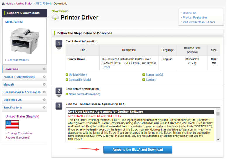 5. Click the “Print Driver” link under the “Drivers section and then click the “Agree to EULA and download” button.