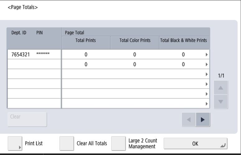 7. Press [Print List] to and [Start Printing] print the counter information for each of the Department IDs displayed on the touch panel display.