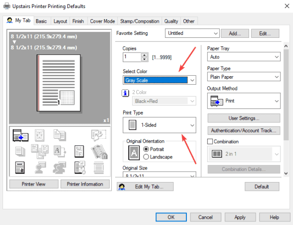 5. On this screen you can select the default printing options you would like such as color and two sided printing.