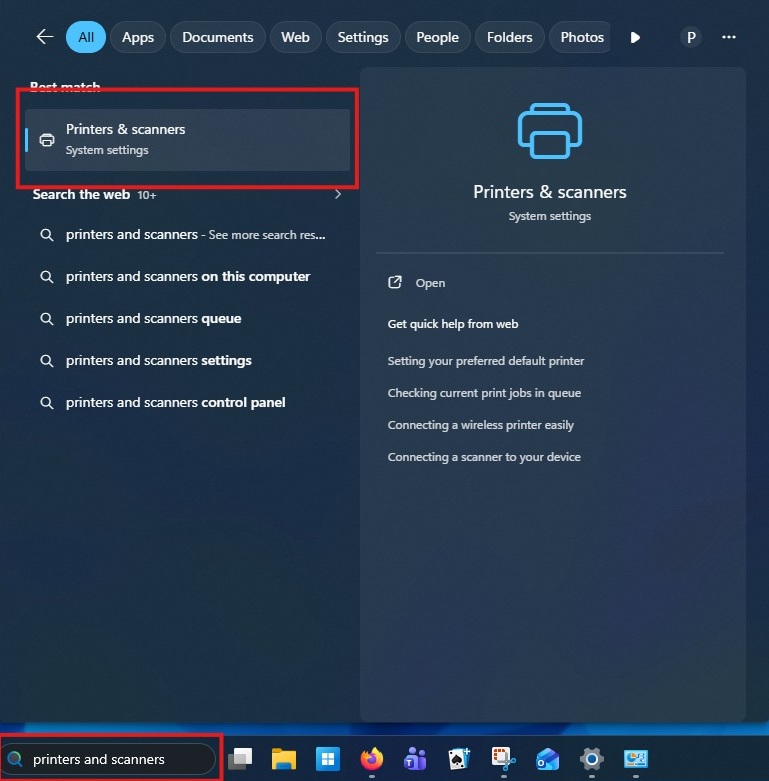 Left click in the search bar and type printers and scanners, then select it from the list