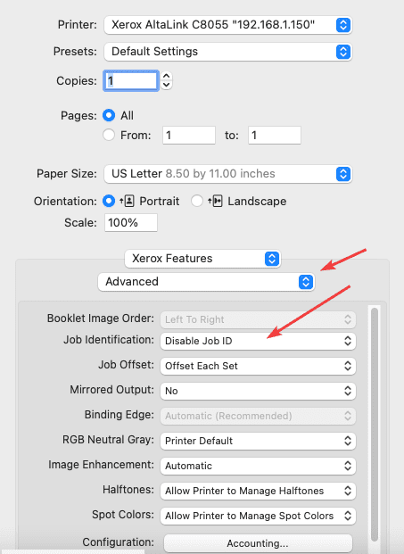 3. Make sure the correct printer is selected in the dropdown at the top and then look for the “Safari” dropdown. Click the dropdown and choose “Xerox Features”. From here you can select your default settings, such as one side and color or B&W printing. To prevent extra pages from being printed when sending jobs, click the drop-down below “Xerox Features” and select “Advanced”. Look for “Job Identification” and disable it.