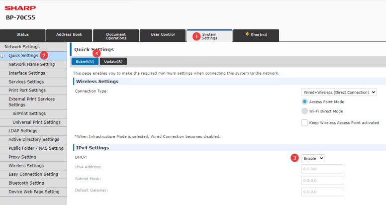 3. Select the “System Settings” tab at the top, then Network Settings and Quick Setting should already be selected. Scroll down to the “IPv4 Settings” and at the DHCP drop down select enable and then scroll to the top and select “Submit”. The machine will Prompt if you would like to Reboot Now or Reboot Later. Choose Reboot now.
