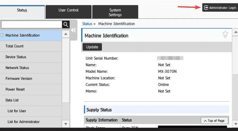 2. On the right select “Administrator login” and input the password and select “Login”. The default password is “admin” if that doesn’t work please contact your IT Administrator.