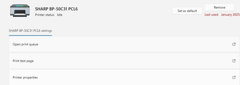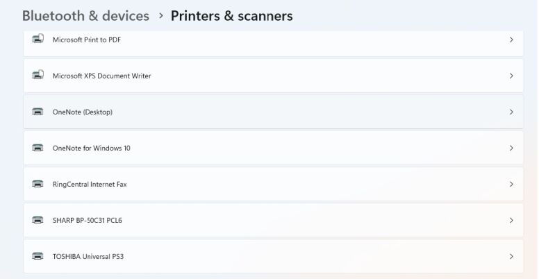 5. If you currently already have the print driver installed you will need to update the IP address in it. On Mac computers you will need to follow How to Install a Sharp Printer on Mac to reinstall the MFP with a new IP Address to reinstall your driver. On Windows 11 you will use the Search option on your taskbar to open Printers and Scanners. Find your printer and click on it.