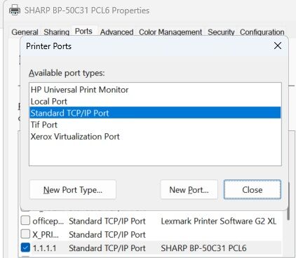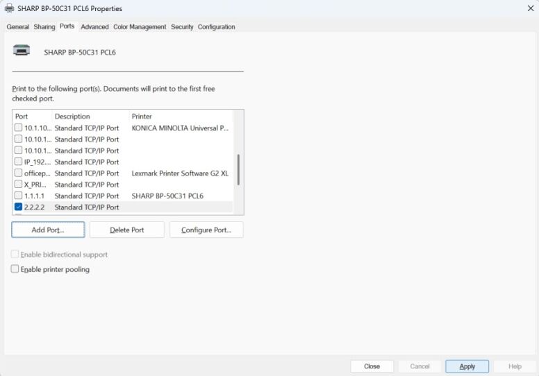 9. It will go back to the Printer ports box. Click Close then Click Apply in the lower right corner. The printer will be pointed to the new IP address.