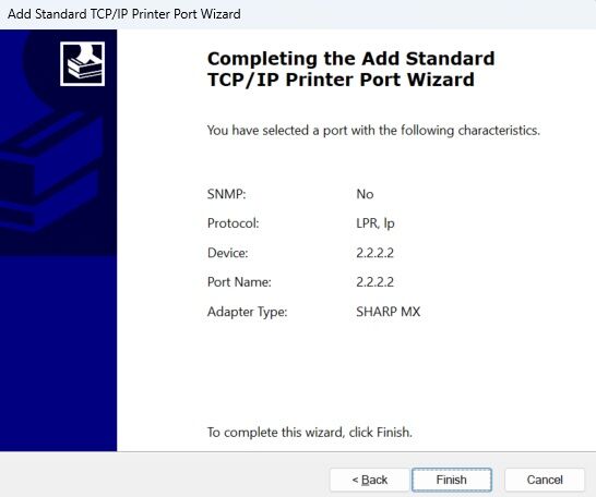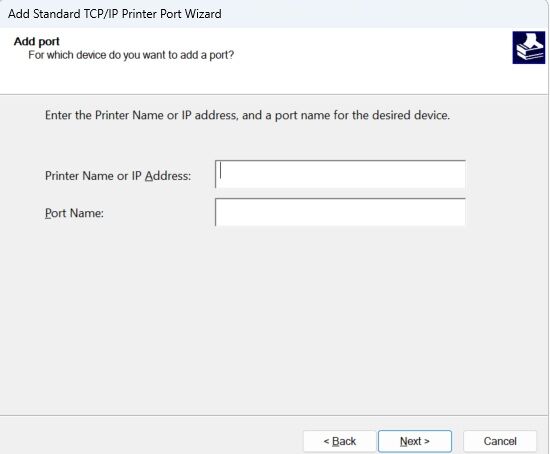 8. Click Next. In the Printer name or IP address type in the newly acquired IP address of your machine and click Next. Continue through the wizard until you can choose Finish.