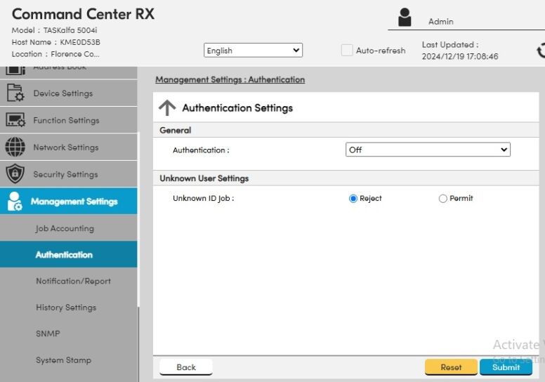 6. Click Authentication and then Settings. Change Unknown User Settings to Reject. Click Submit.
