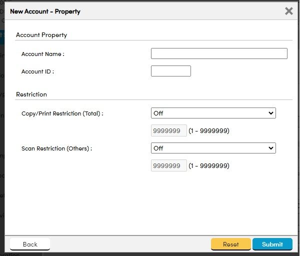 7. Go back to Job Accounting. Click the + Add Account Button. Enter an Account Name (a Department or an Individual’s name). The Account ID will be a numeric password for the Account. Click Submit. Continue to enter any additional Accounts. Then use our How to Setup Kyocera Job Accounting on Windows or MAC guide.