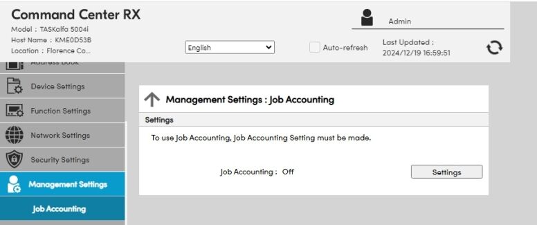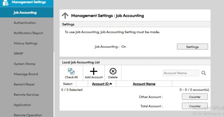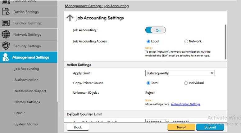 5. Click on Management Settings and Job Accounting. Click Settings. Turn on Job Accounting. Set Job Accounting Access to Local. Change Copy/Printer Count to Total. Click Submit.