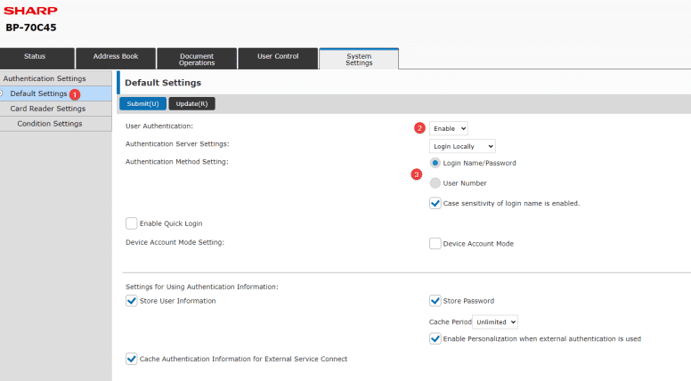 5. Make sure you are on the “Default Settings” tab, select the top drop down and choose “Enable”. We suggest using “User numbers” for simplicity but if you prefer, Login Name and Password is an option as well.