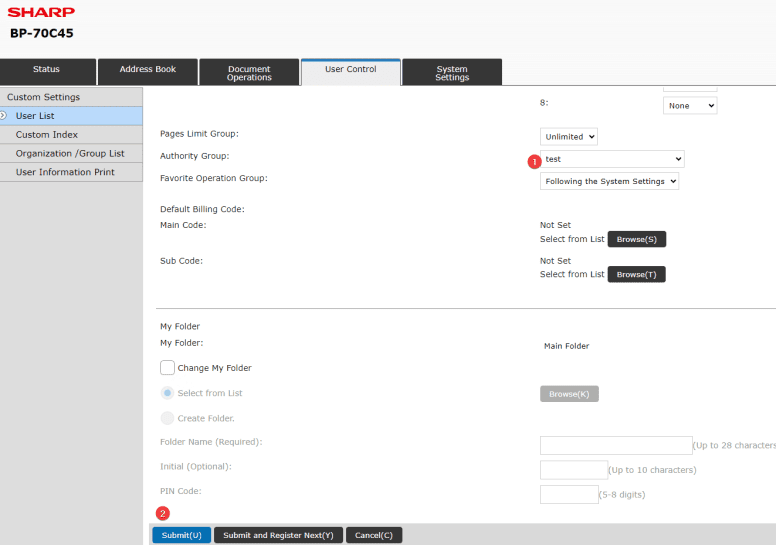12. Name the User and then choose a Login Name/Password or User Number depending on the option you selected earlier. Scroll down, in the “Authority Group” choose the group you created in the step before and then select “Submit”