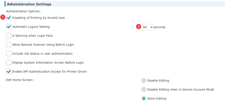 6. Scroll to the “Administration Settings” and check the top box, Disabling of Printing by Invalid User, this prevents anyone from printing unless they have a code. You may also change the screen timeout which will automatically logout the user if there is no input detected in the specified time. Scroll back up to the top and select “Submit”.