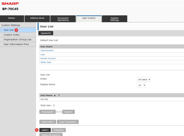 11. Make sure you are on the “User list” option to the left and then select “Add”.