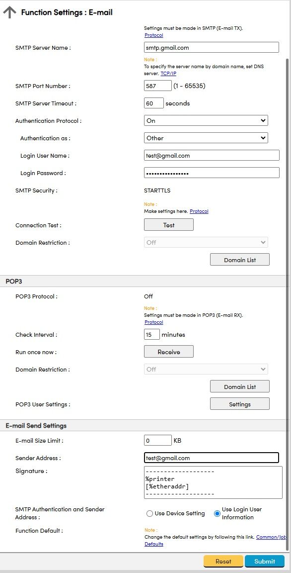 7. Enter your SMTP server, Port Number, and adjust the timeout settings if necessary. Most mail servers will need authentication. Change the Authentication Protocol to On if necessary and set Authentication as to Other. Enter your email account as the Username and the Password. Keep in mind mail providers like Gmail use an App Password for the Password field which will be covered in another guide.