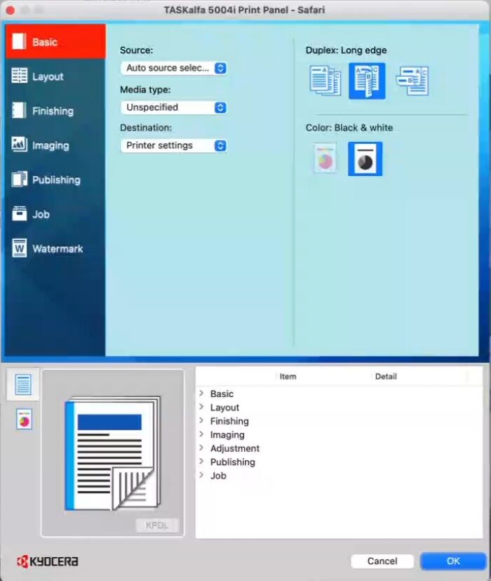 5. Click Job and check the Job Accounting button. Enter your Account ID number. You can also go to Basic and any other choices on the left and set your default settings. Such as if you want the printer defaulted to Black printing. Click Ok twice.