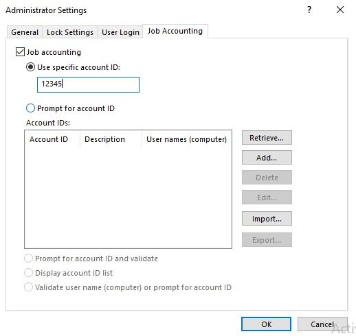 9. Click the Job Accounting tab. Click the box to turn on Job Accounting. Choose Use Specific Account ID and enter your Account ID number. Click Ok twice. Do a test print to verify operation.