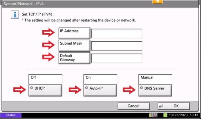 9. Select DHCP and set it to On. set Auto-IP to On and Set DNS Server to Auto.  After making your selections touch Ok.
