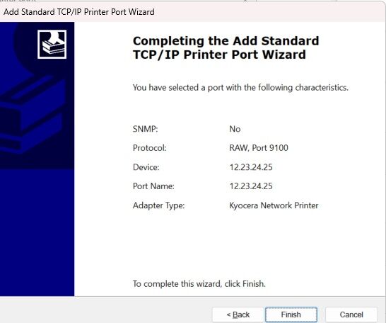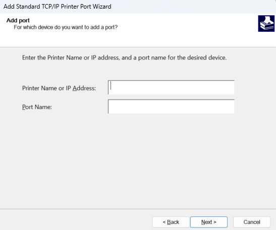 16. Click Next. In the Printer name or IP address type in the newly acquired IP address of your machine and click Next. Continue through the wizard until you can choose Finish.