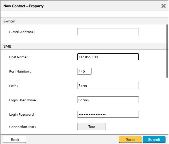 13. Fill in the Name field at the top for the Scan Key Name. The Hostname field will be the Computer name or IP address of the PC you are wanting to scan to. The path will be the name of the folder you created. Login name will be the Account Name you created or want to use for authentication (Scans account or your Username to your MAC) and Password is the password you created or your MAC Password if using your primary account. Click the Test Button to test the connection. Click the Submit button.
