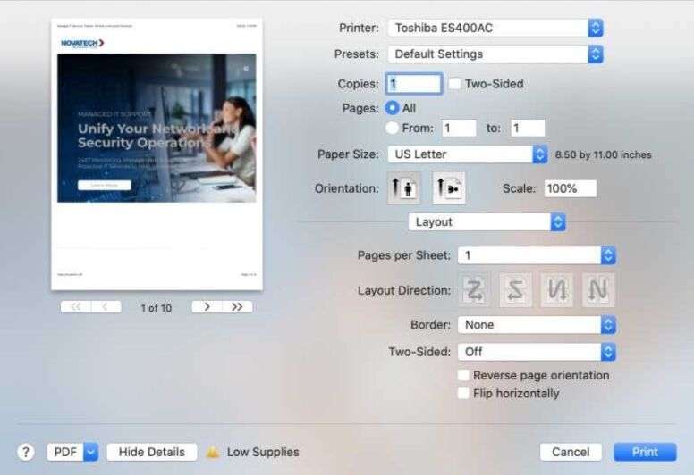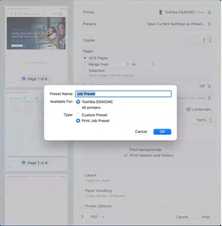 6. Under the Presets Menu select Save Current Settings as Preset and give it a name. Click Ok. Then click Print. Any time you open an application make sure the Preset field is set to the named Preset. After using an application for the first time with the Preset it will typically default that way. Any other options such as choosing Color or 2 Sided for a Print job can still be made with the Preset turned on.