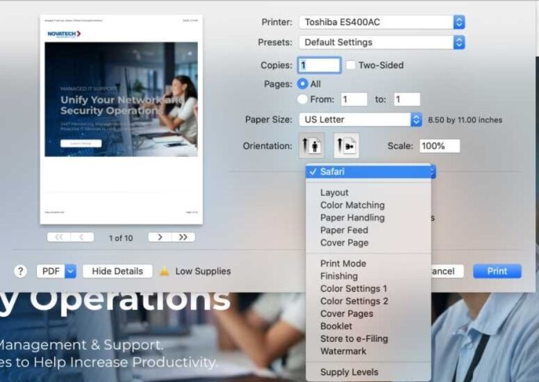 3. Make sure the correct printer is selected in the dropdown at the top and then look for the “Safari” dropdown. From here you can go through each section and choose your default options.