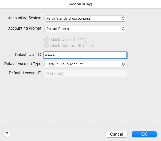 4. In the accounting window, select “Xerox Standard Accounting”. For the “Accounting Prompt”, you can choose to have it pop up in a window for each print or to store the info in the driver. If you choose to not have it prompt, go ahead and put the “User ID” in the field and then, for the “Account type”, choose “Default group” and hit “OK”.