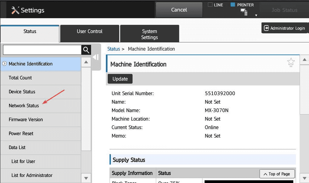 1. Start by finding the IP address of the copier. You can press the “Settings” button on the main screen and then “Network Status” to find it.