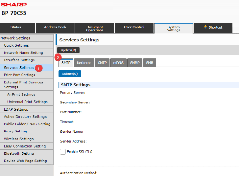 4. Press the “System Settings” tab and then select “Service Settings” make sure you are on the “SMTP” tab and fill out the fields referenced below then click “Submit” when finished.