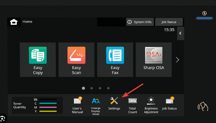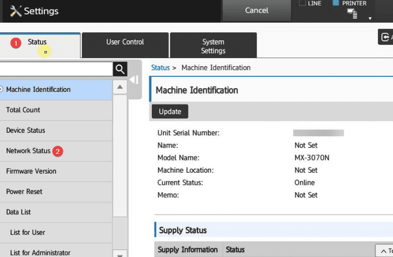 8. Go to the copier and press the “Settings” button and then the status tab and “Network status” and write down the “IPv4 address”.