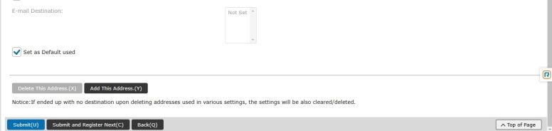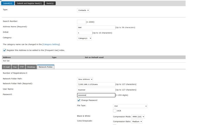 11. Click on the Network Folder tab. In the Address Name field type the name you want on your Address Key on the operator panel. In Initial enter the first letter of that name. Click the Register this address to be added to the [Frequent Use] box. In Network Folder path use the format in the picture below. After the \\ you will enter your computer IP address or the Hostname of your PC. Then after the single \ you will enter the scans folder name. In the User Name field enter the User Name you have created. Then Check the box for Change Password and enter the Password. Scroll down and click Set as Default used and Click Submit.