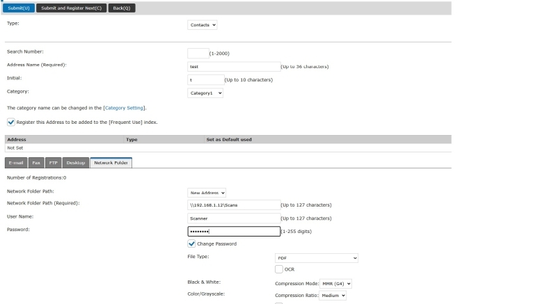 11. Click on the Network Folder tab. In the Address Name field type the name you want on your Address Key on the operator panel. In Initial enter the first letter of that name.  Click the Register this address to be added to the [Frequent Use] box.  In Network Folder path use the format in the picture below. After the \\ you will enter your computer IP address or the Hostname of your PC. Then after the single \ you will enter the scans folder name.  In the User Name field enter the User Name you have created. Then Check the box for Change Password and enter the Password. Scroll down and click Set as Default used and Click Submit.