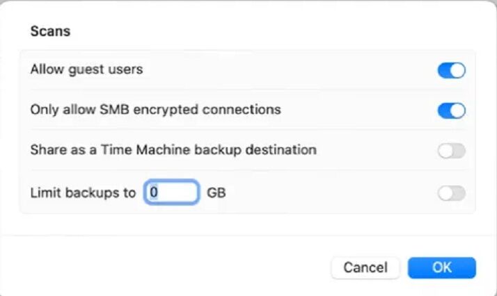 4. To select a specific folder to share, click the Add button at the bottom of the Shared Folders list, locate the Scans folder, select it, then click Open. Right-click the name of the shared folder, then choose Advanced Options to turn on the following options. Only allow SMB encrypted connections . Click OK