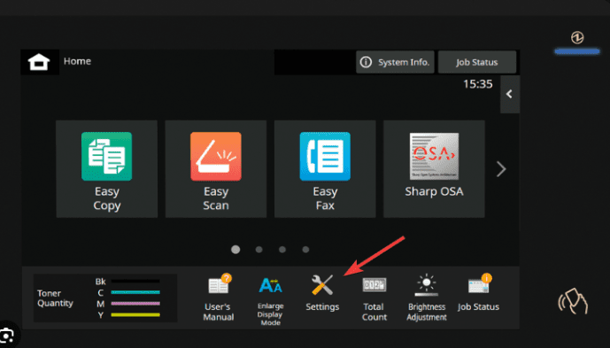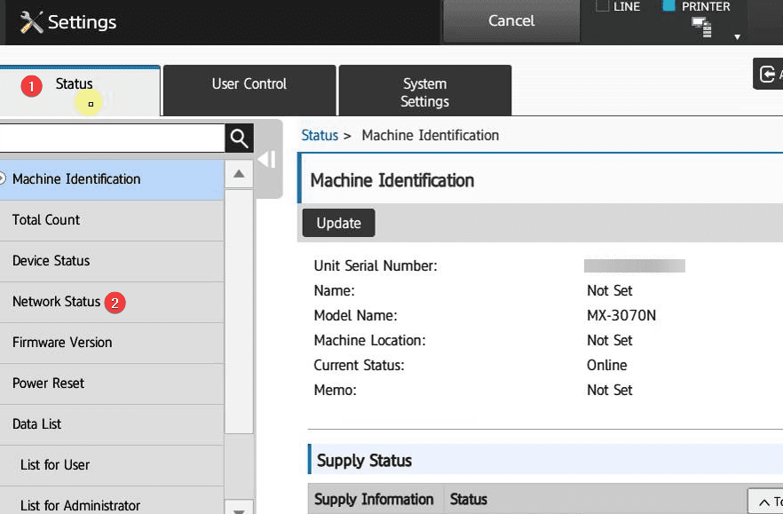 15. Go to the copier and press the “Settings” button and then the status tab and “Network status” and write down the “IPv4 address”.