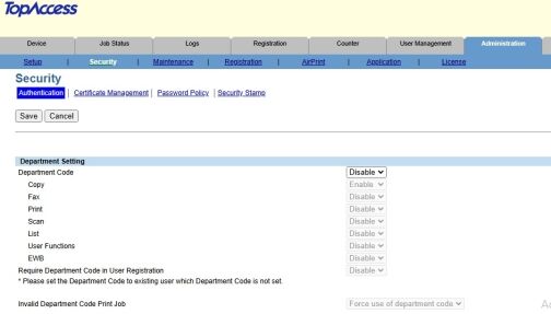 9. Click the Administration tab. Click Security. Change the Department Code setting to enable and click Save. If you have setup User Authentication instead scroll down on the same screen and change the setting to Enable. After finishing restart the MFP with the main power switch. The screen will now prompt for your Department ID to login when copying.