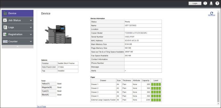 22. Click Login in the Upper right hand corner. Depending on the machine model the screen may look different but will have login fields. Enter admin as the Username and 123456 as the password. If the login does not work contact your I.T. to see if the password has been altered.